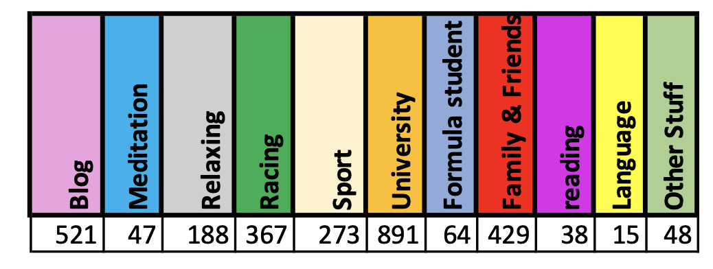 Comparing the numbers we can clearly see, that not only the effort for my blog got increased by quite a lot, but that I also spend more time on university projects. Doing less sport because of the corona situation? Nahh! Not really! But sure, I spent a bit more time with my family and friends!