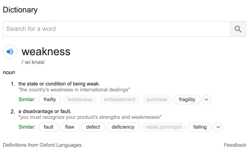 I guess we should better do not loose any more time, then! Let’s go! Can you define the terminology “weakness” for me, please? Ah, don’t worry! I bet google can do it much faster!
