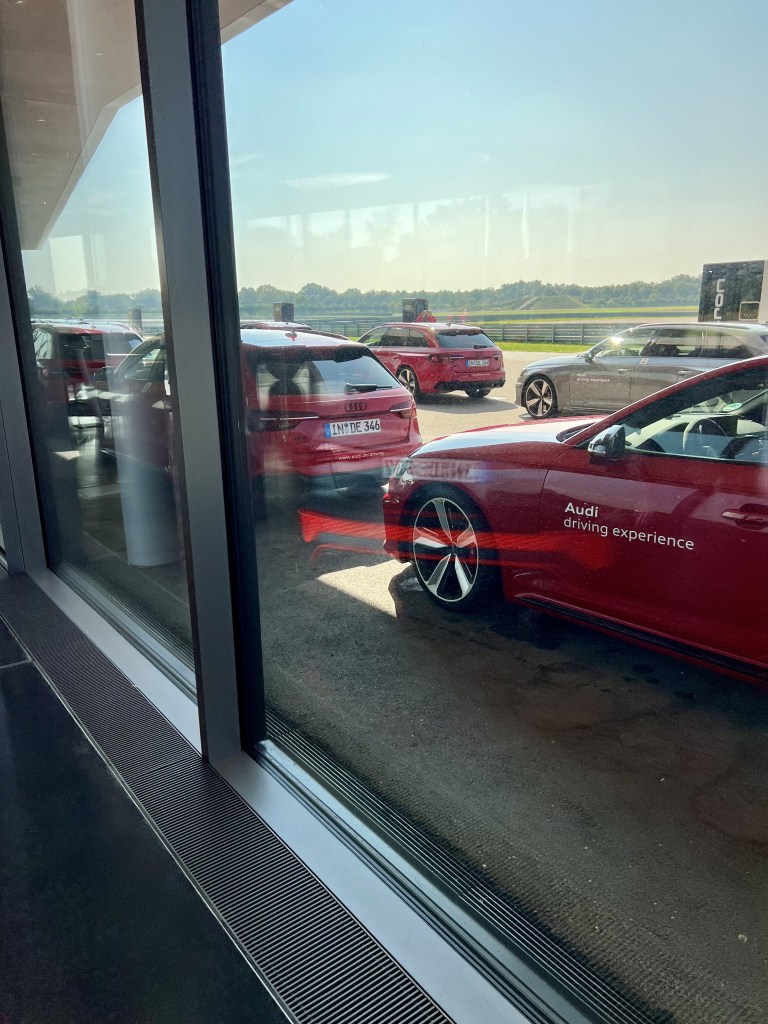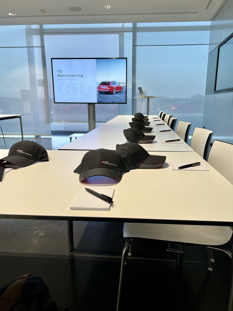 The day started as expected. I got up early, 3:50 am, got ready to go and started driving at 4:30 am. I reached Neuburg after some 2 hours 30 minutes. I know the tour until Ingolstadt by heart these days, so only the last part was really new. I arrived early, had some 45 minutes until the event would start. Time to look at the cars in the showroom, to look at the track, to talk with the other participants. The event started with the theoretical part. Precise information, experienced instructor, good presentation. There was nothing new for me, but for the others it seemed like they really needed the info.