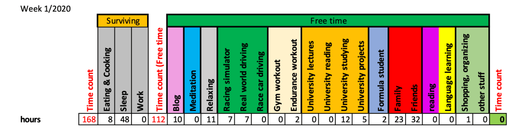 The numbers are always hours. At the beginning, you can see the the surviving mode, eating, sleeping and working. I remove them from the actual time of a week and get the “Free time count“. Time, which I can use, and actually do use.
